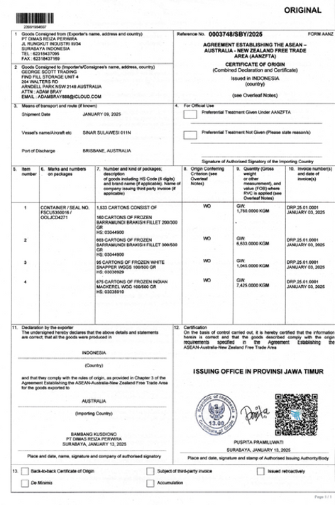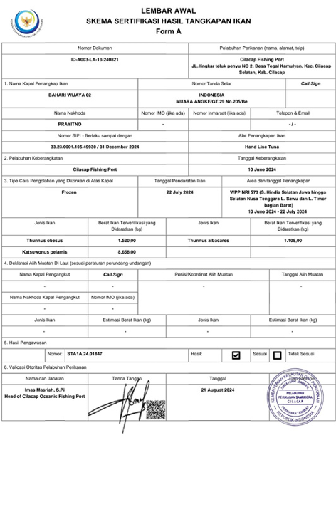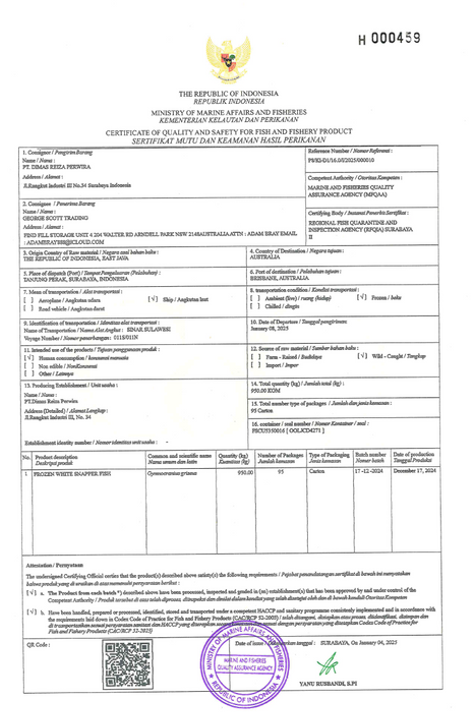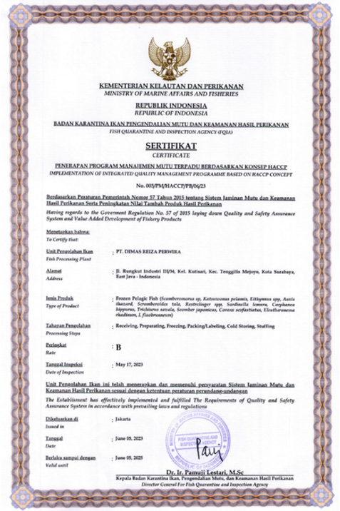 “Our seafood export operations are supported by complete and internationally recognized certifications, ensuring full compliance with global import requirements. We provide all mandatory export documents such as Health Certificates, Catch Certificates, Certificates of Origin, laboratory test reports, and other official documents required for international seafood trade. These certifications demonstrate our commitment to product safety, traceability, and regulatory standards, allowing importers, wholesalers, and distributors to confidently source Indonesian pelagic fish and frozen seafood from us.